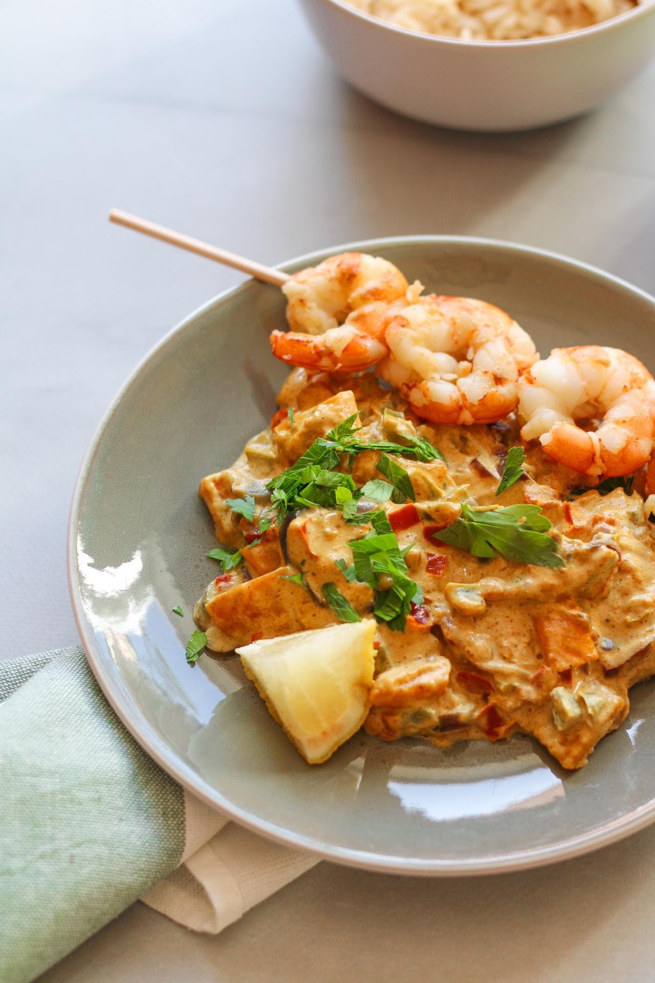 Eu adoro caril! Já testei caril de várias formas mas com abóbora nunca o tinha feito. Por estarmos na época delas, decidi arriscar e verdade é que o resultado final me agradou bastante! 🙂 Para além de ser uma refeição de conforto, é muito versátil, uma vez que as combinações são infinitas, desde, frango, tofu, lentilhas (ver sugestão aqui), gambas, entre outros. Hoje a sugestão é de um caril de abóbora e gambas, com molho de limão e salsa fresca. Vamos a isso?