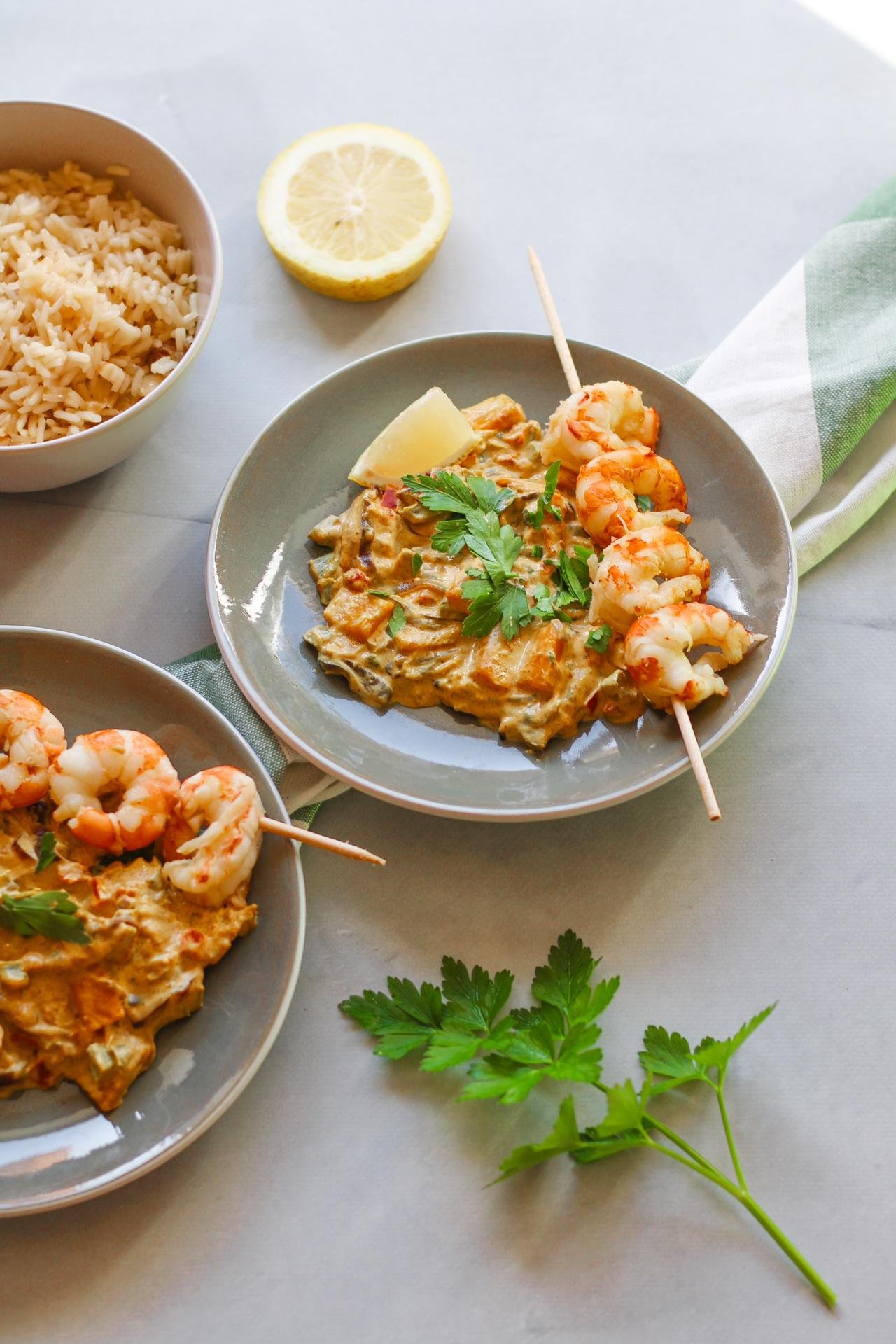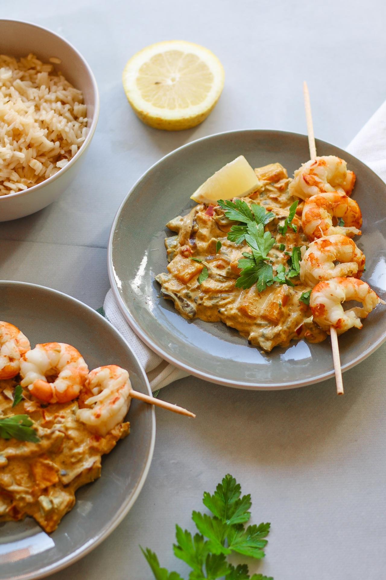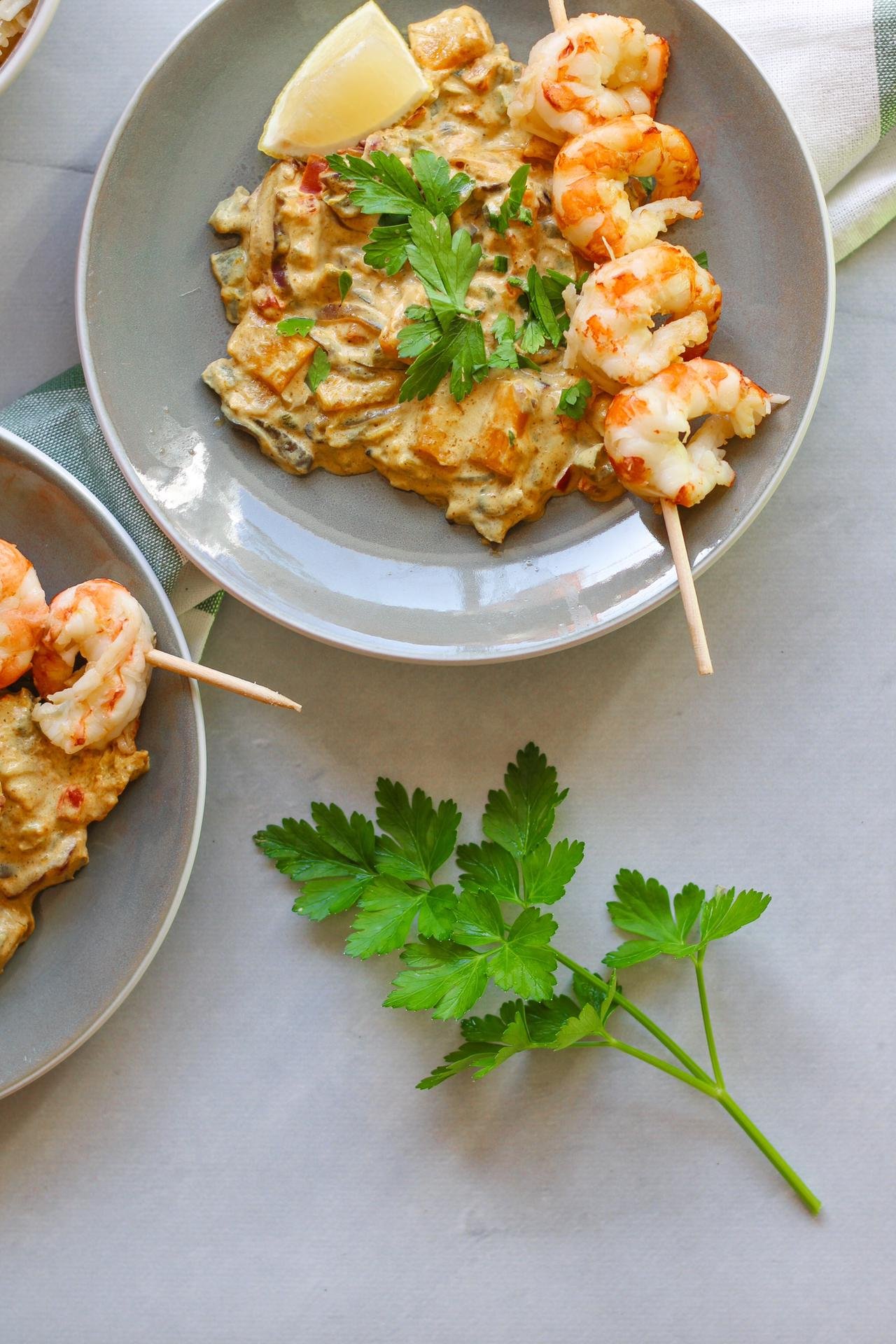 - Enquanto os legumes estão a refogar, preparar as gambas: descascar, limpar o interior e fazer as espetadas. Temperar com sal, sumo de 1/2 limão e grelhar. Reservar.