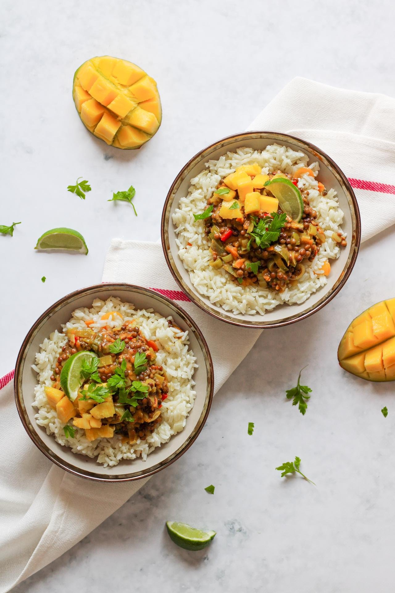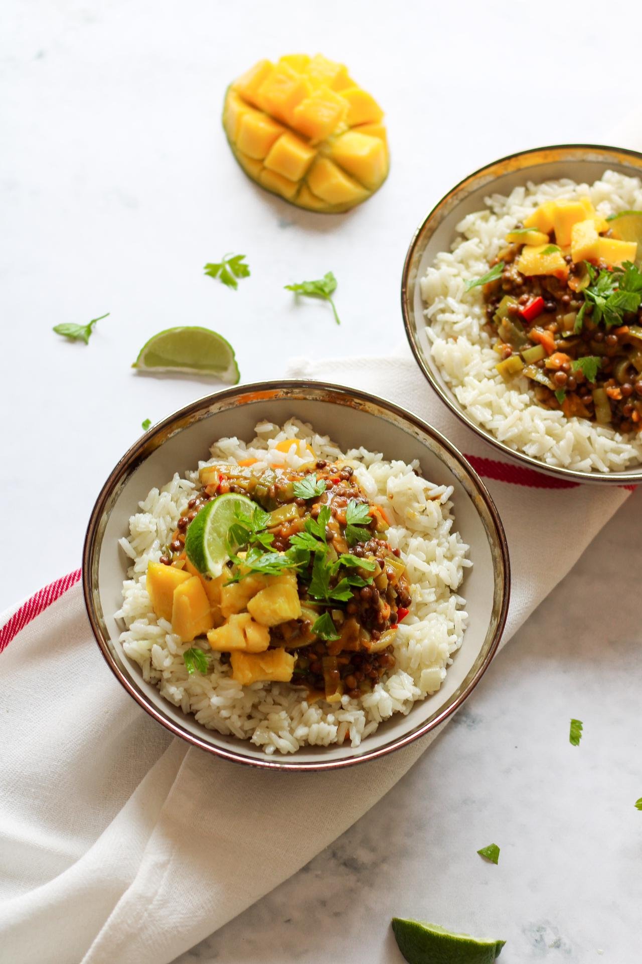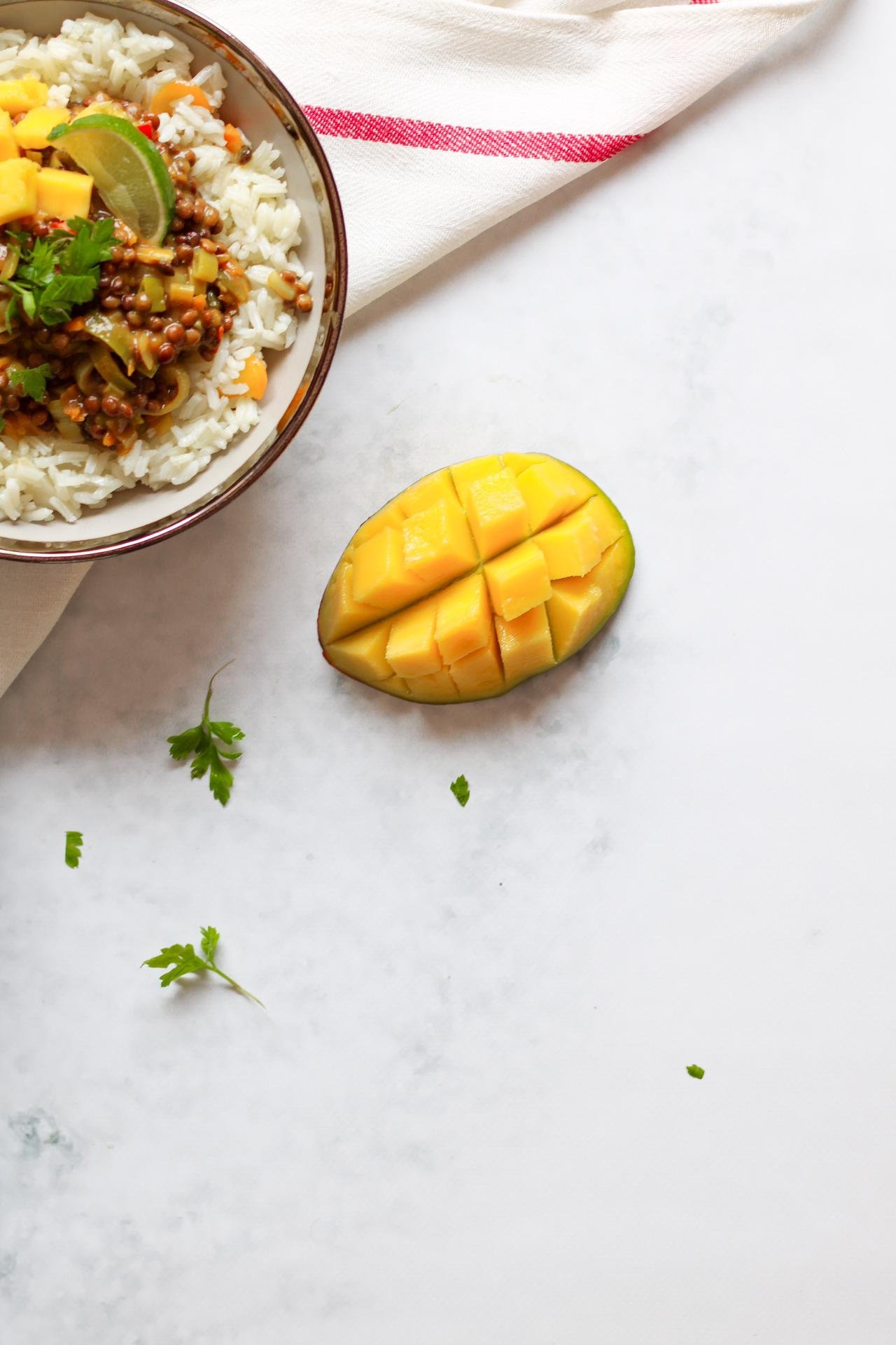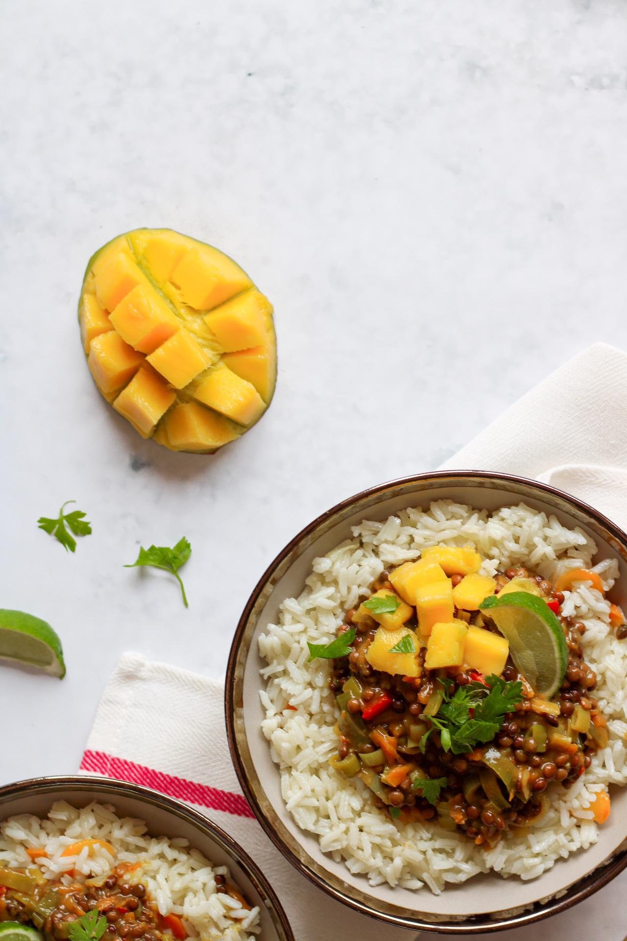 5. Por fim, servir o caril com arroz basmati, cubos de manga fresca, salsa ou coentros frescos picados e sumo de lima. E desfrutar!
