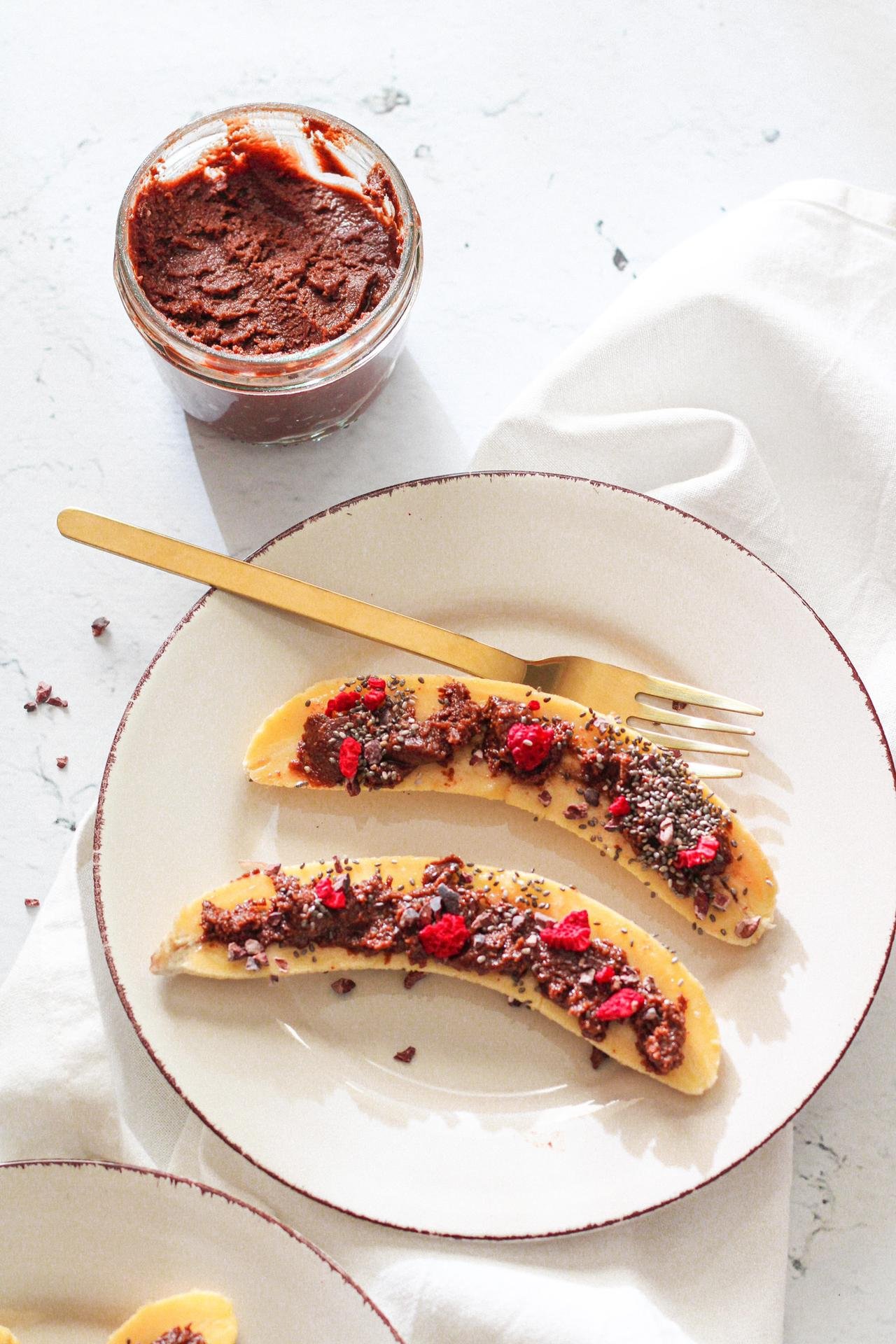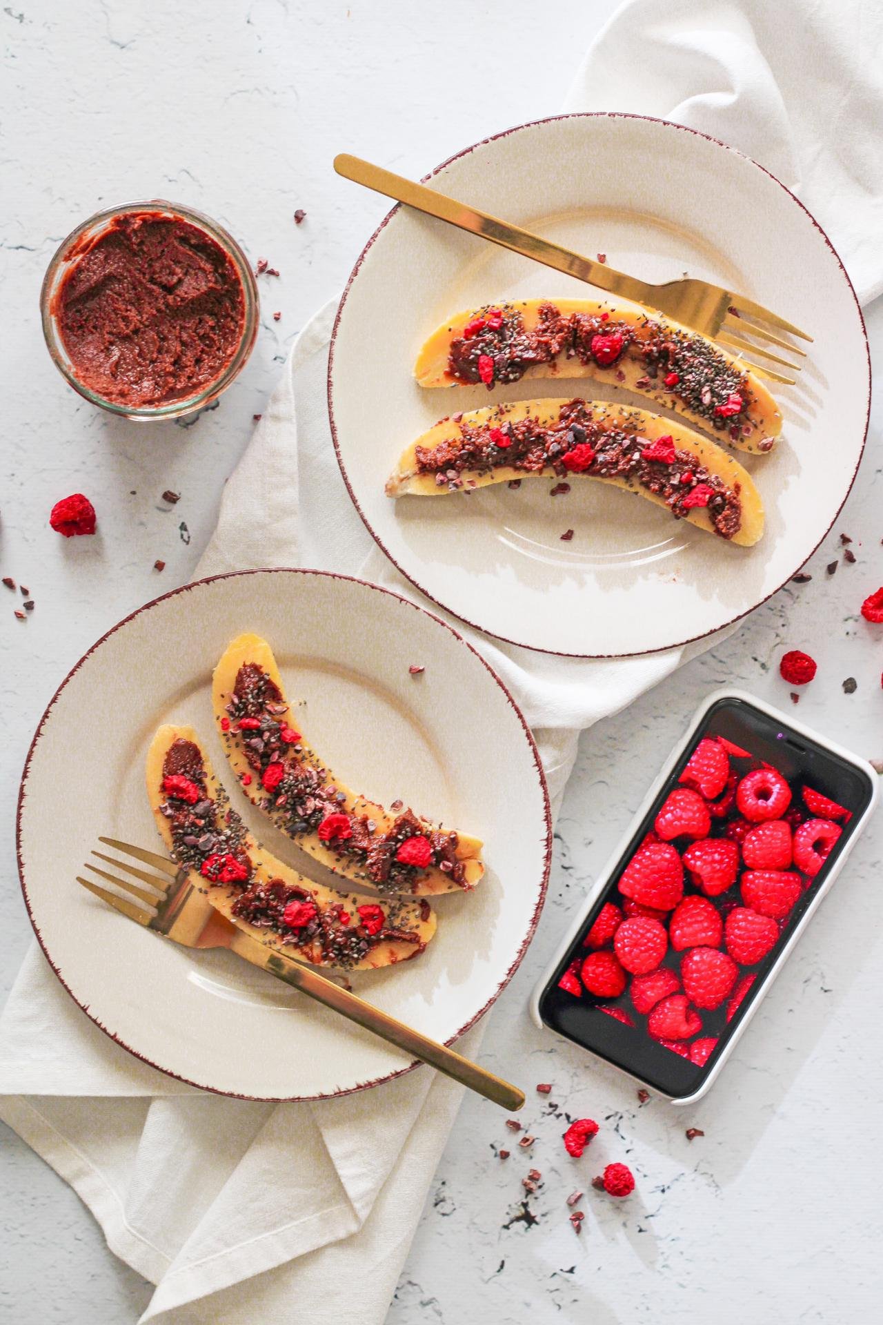 Sugestão de snack: Como sugestão de utilização, fatiei duas bananas na vertical e recheei com o “tulicreme” que acabamos de fazer. Adicionei pepitas de cacau, sementes de chia e framboesas. E desfrutei! 🙂 Mas o mais importante é dar asas à imaganição e fazer diferentes combinações, com diferentes ingredientes!