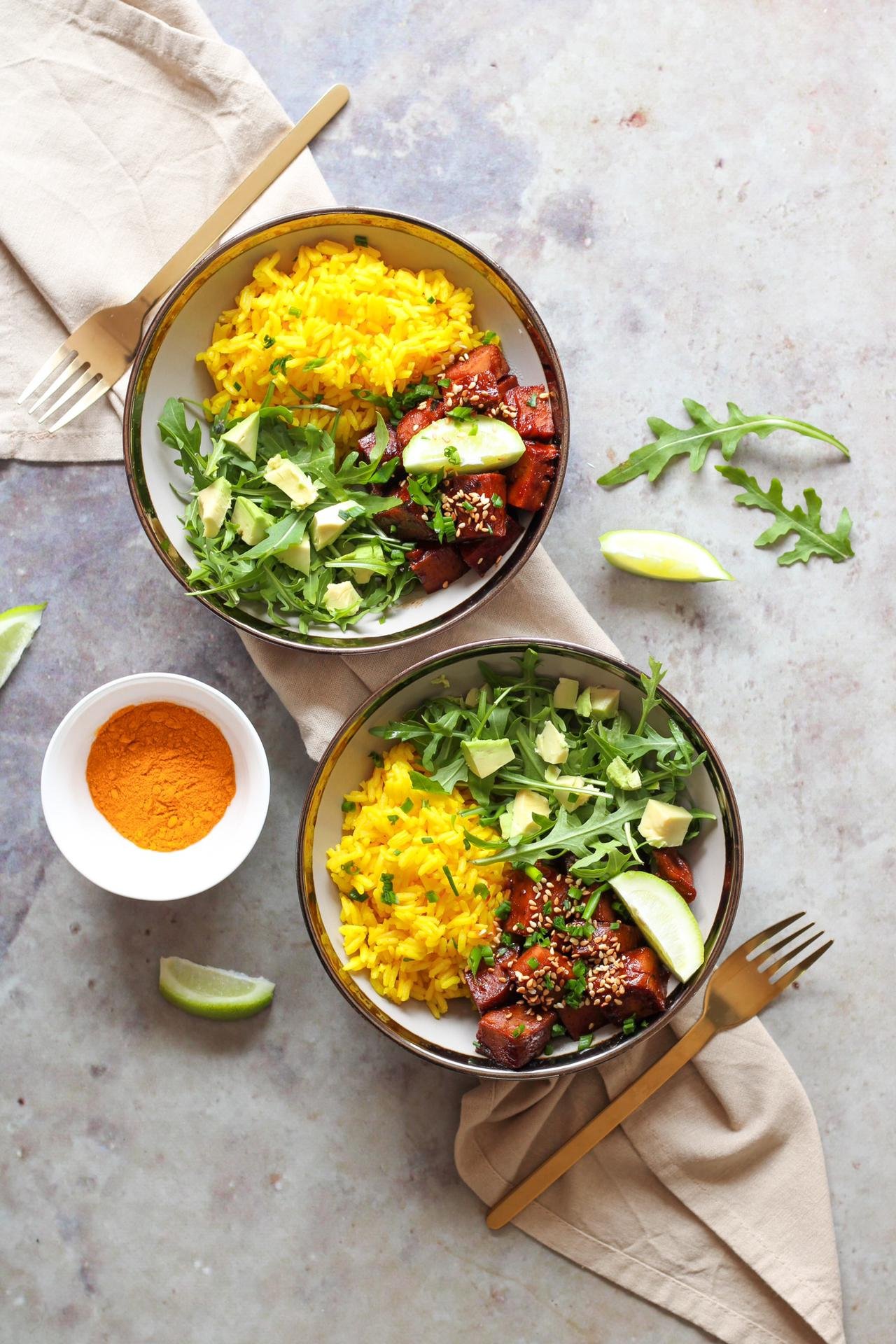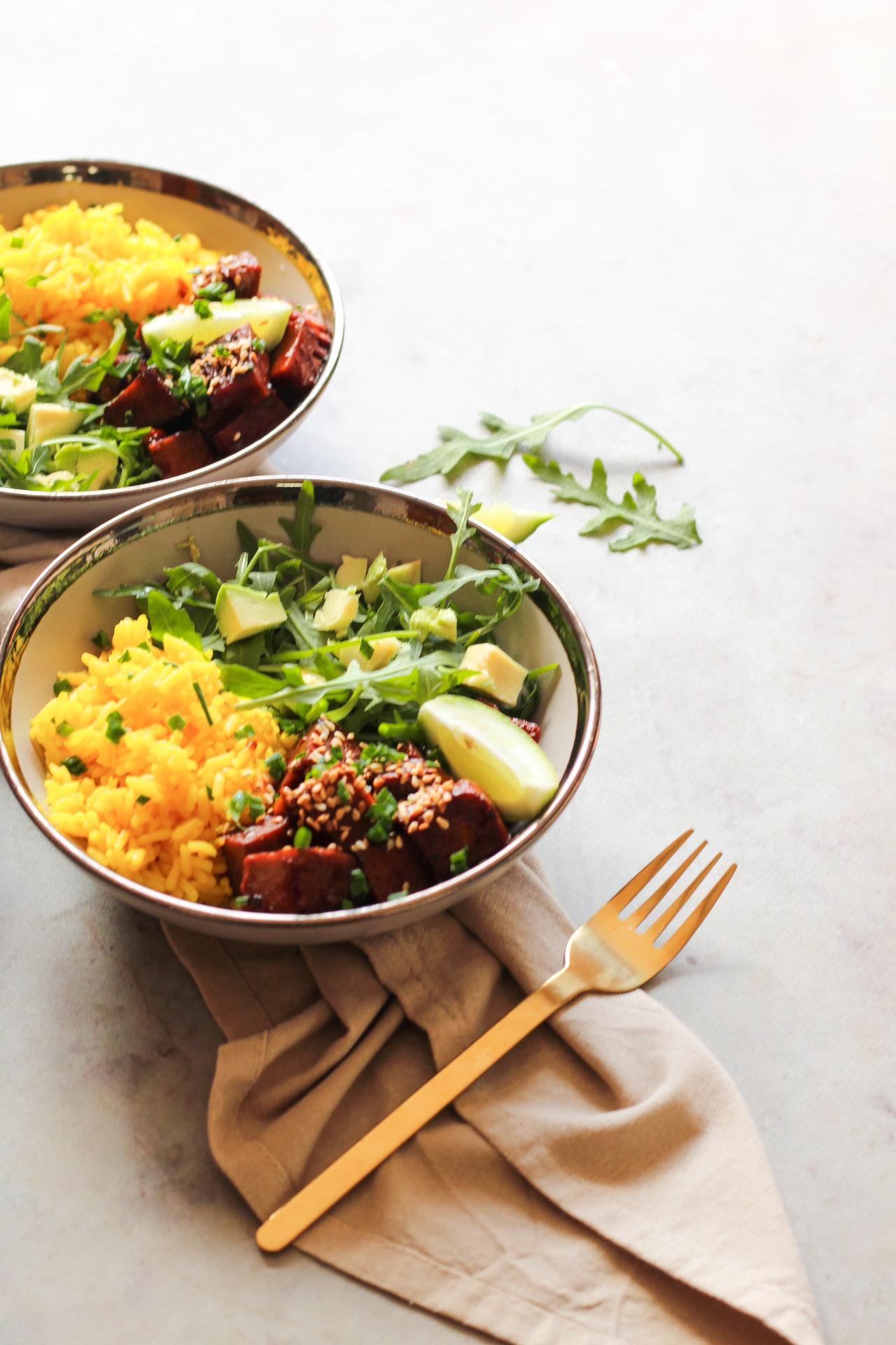 VEGAN BOWL DE SEITAN AGRIDOCE E ARROZ DE AÇAFRÃO